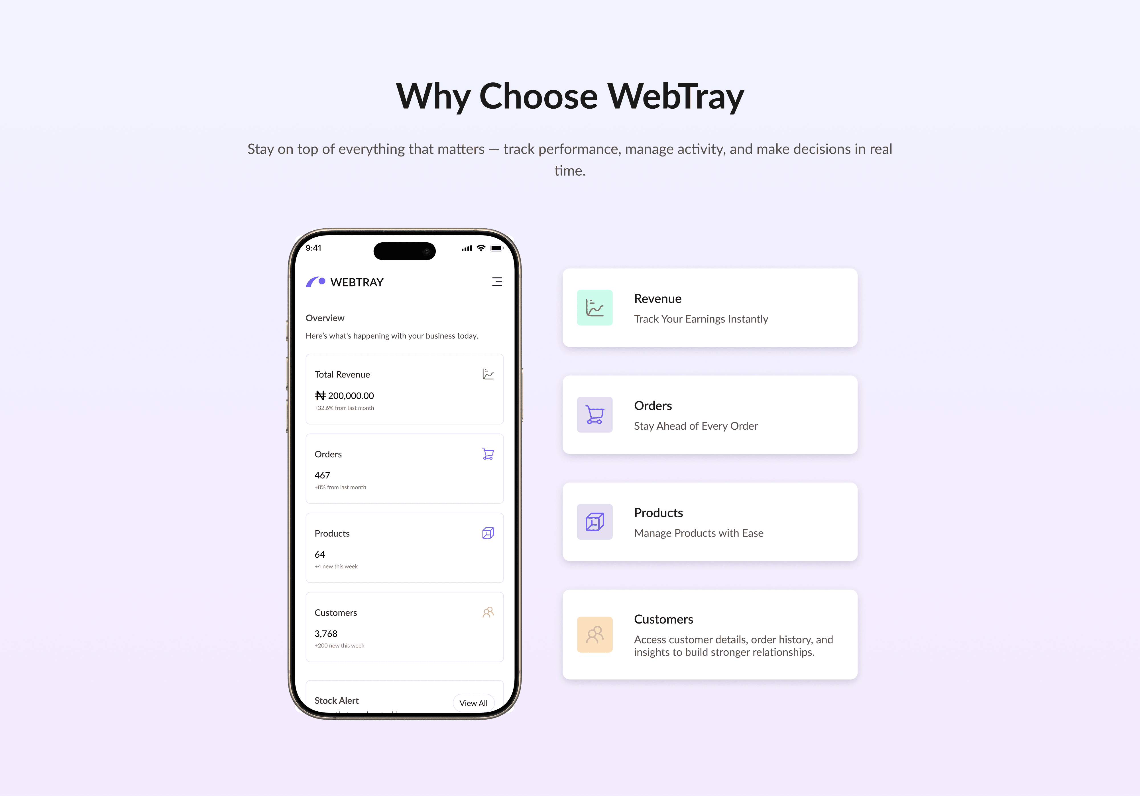 Many small business owners rely on multiple disconnected tools to run daily operations. WebTray brings these critical functions together, reducing friction, saving time, and giving business owners clearer control over how they operate and sell.